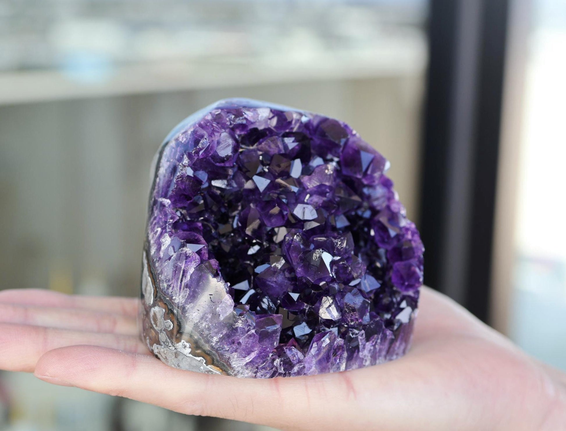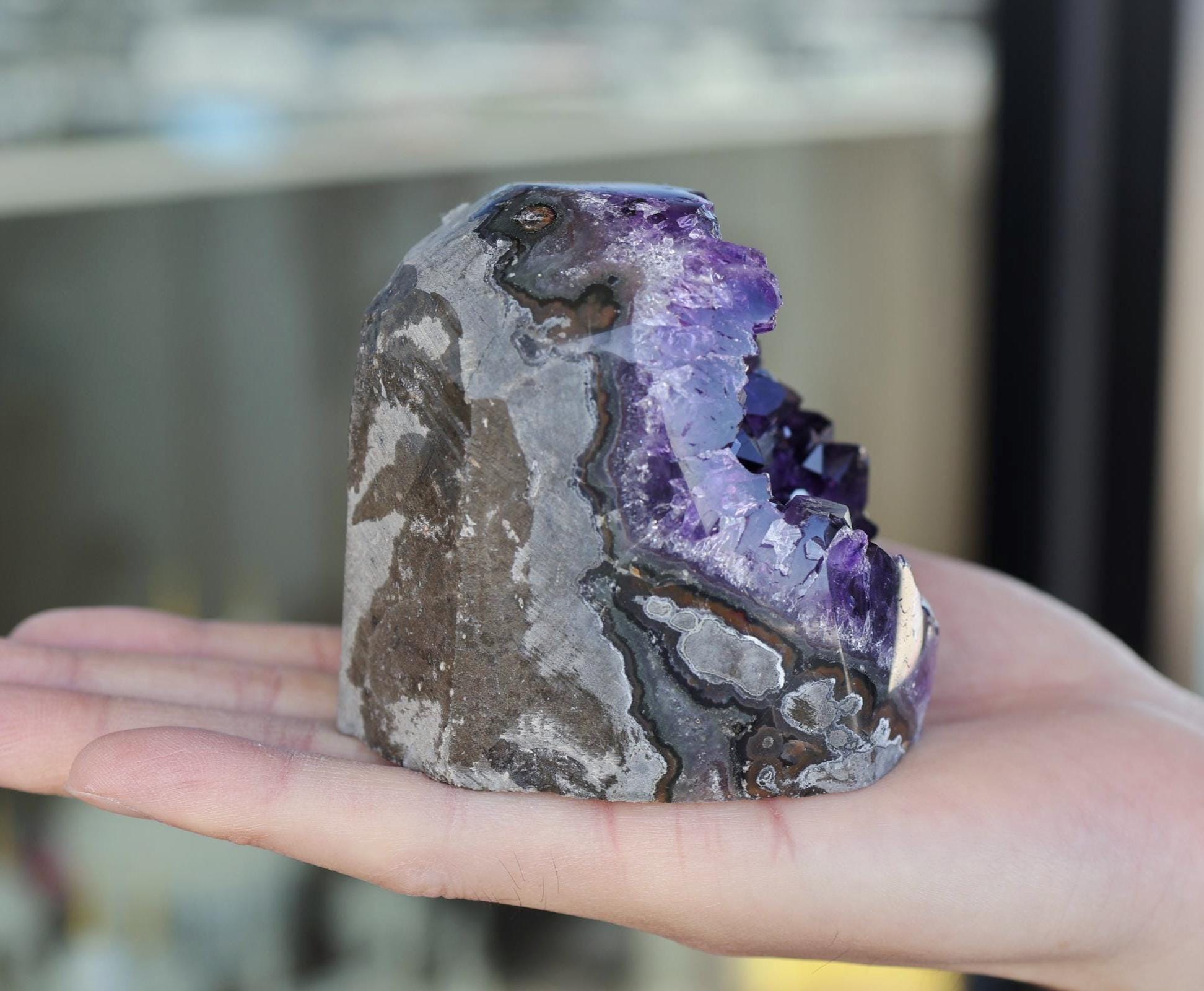 This natural purple amethyst geode cluster weighs 699g and measures 8.3cm in height and 8.8cm in width. Its sparkling crystal formations and vibrant violet tones highlight the unique beauty of amethyst in its raw form.