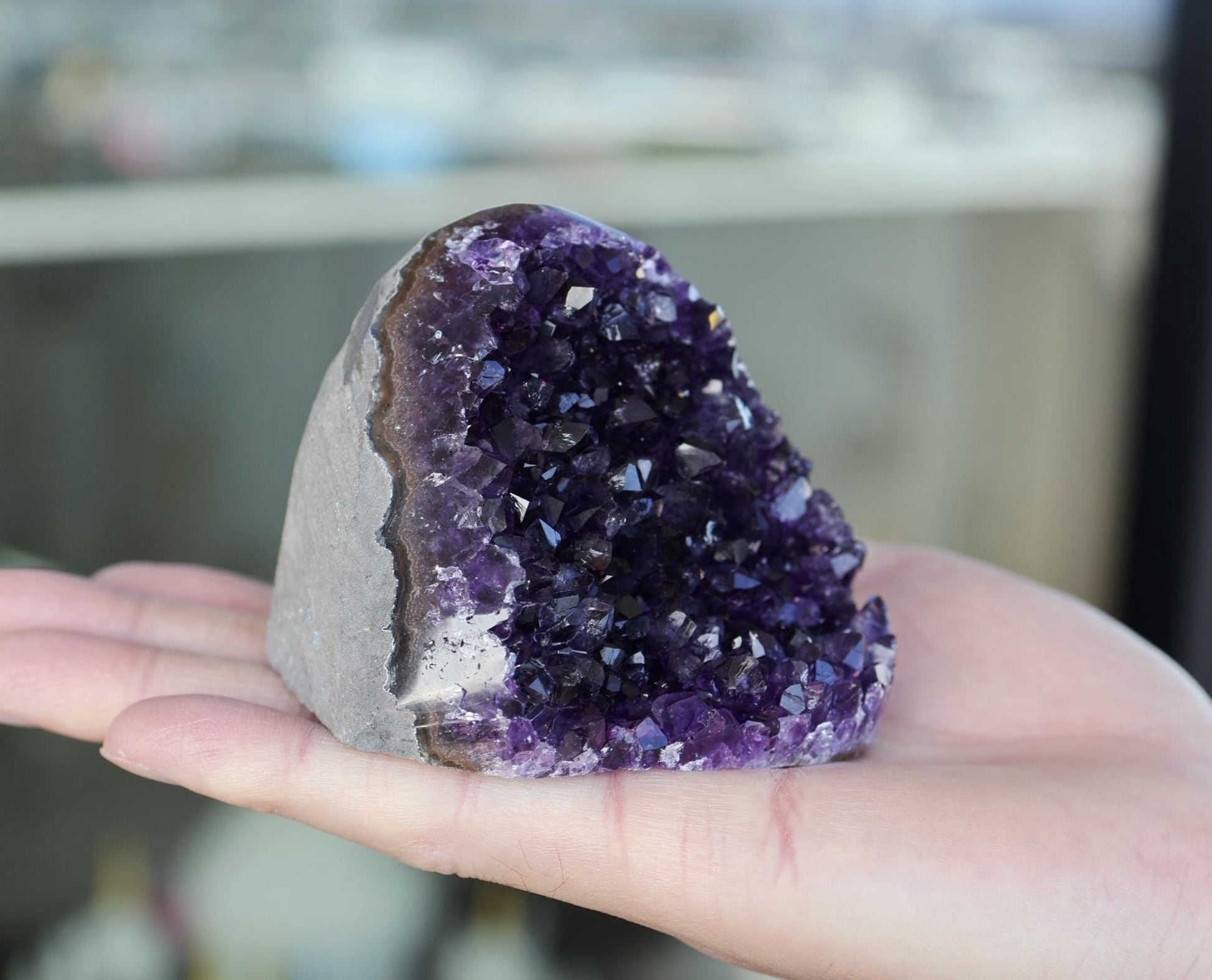 This natural amethyst geode cluster weighs 420g and measures 8cm in height and 7.6cm in width. Its deep purple crystals and radiant luster highlight the raw beauty of amethyst.