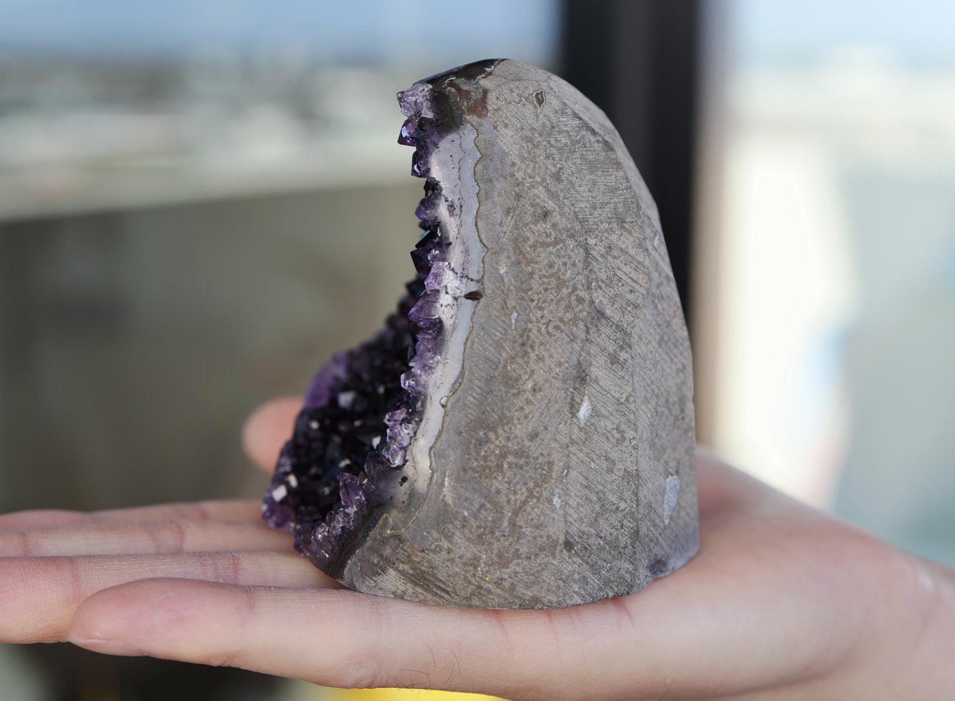 This natural amethyst geode cluster weighs 565g and measures 8.8cm x 7.4cm. Its deep purple crystals and radiant luster make it a striking specimen.