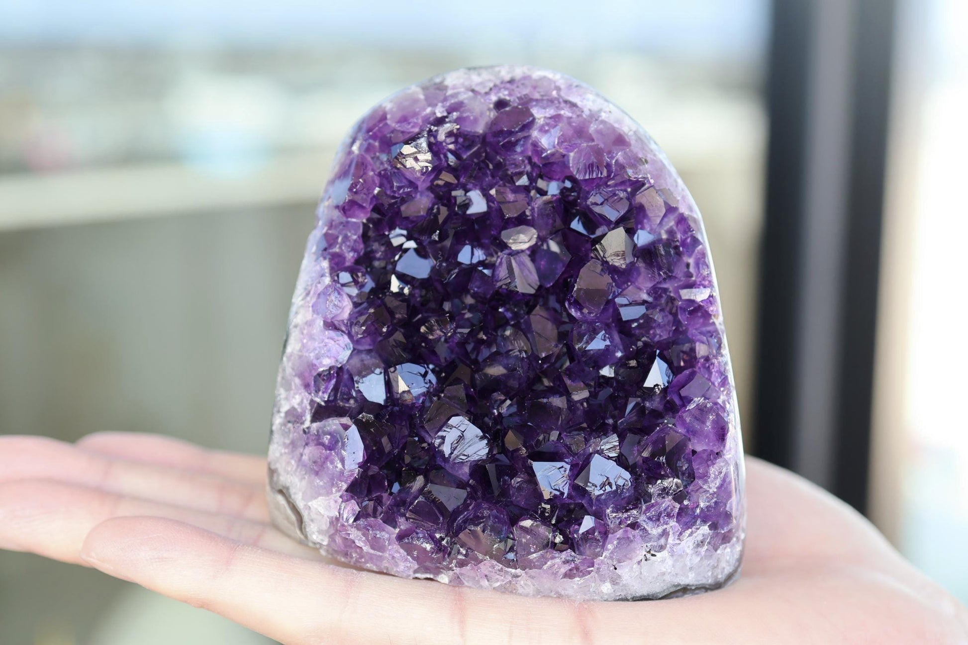 This natural amethyst geode cluster weighs 764g and measures 9.6cm in height and 8.7cm in width. Its deep purple crystals and radiant luster showcase the beauty of amethyst in its raw form.