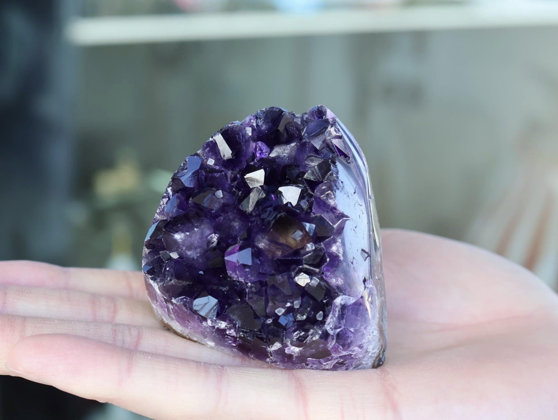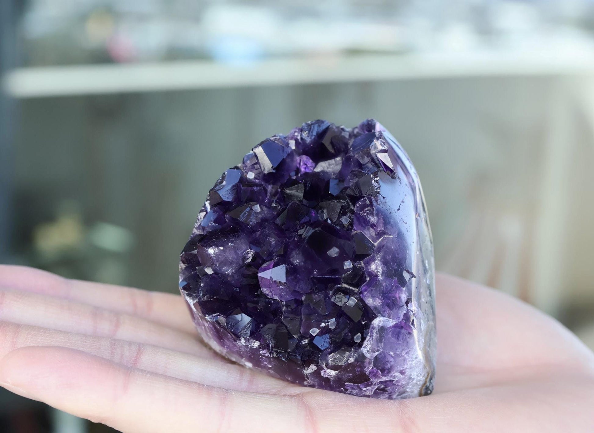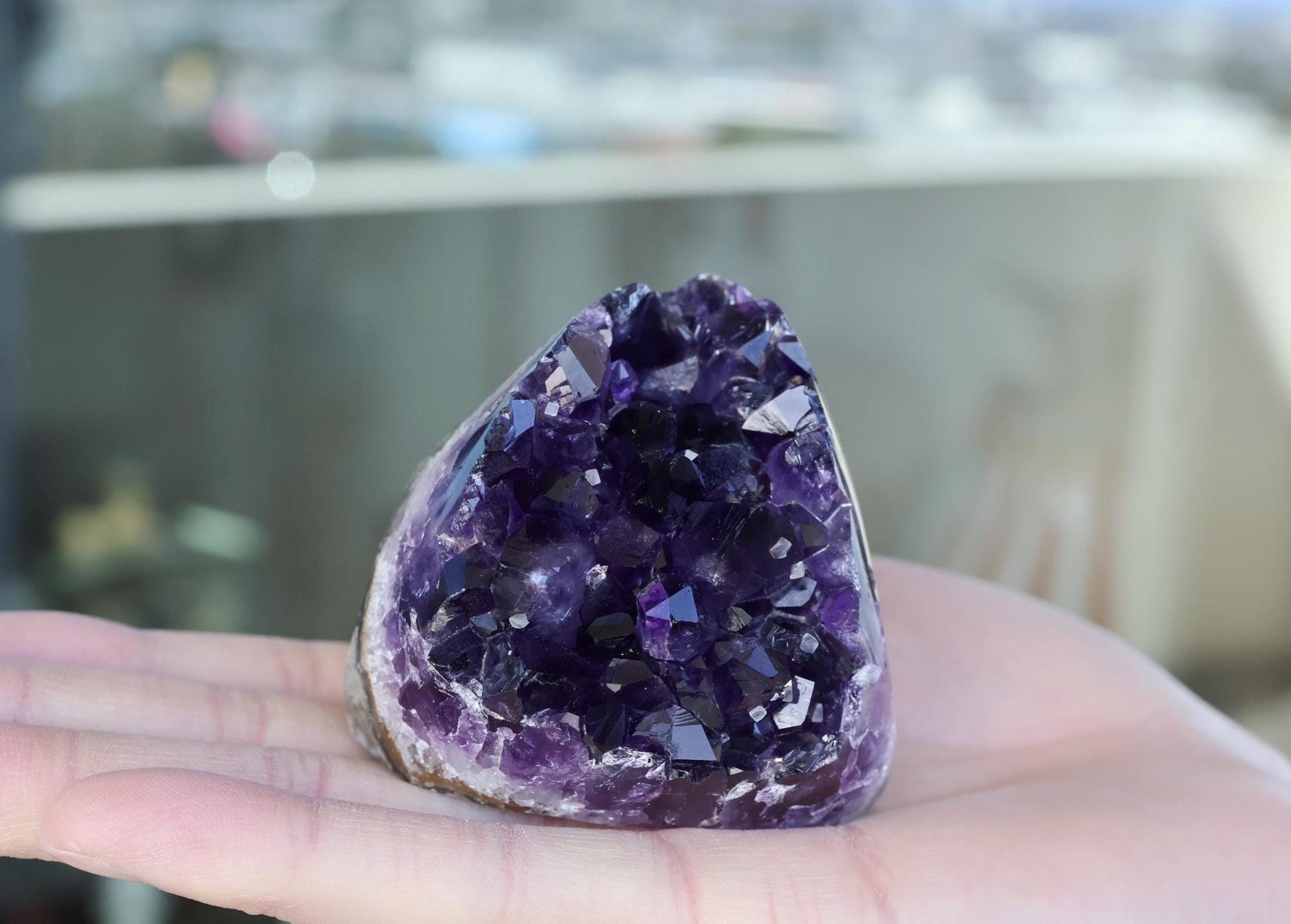 This natural purple amethyst geode cluster weighs 304g and measures 6.2cm in height and 6cm in width. Its deep violet crystals with exceptional clarity and luster showcase the natural beauty of amethyst.