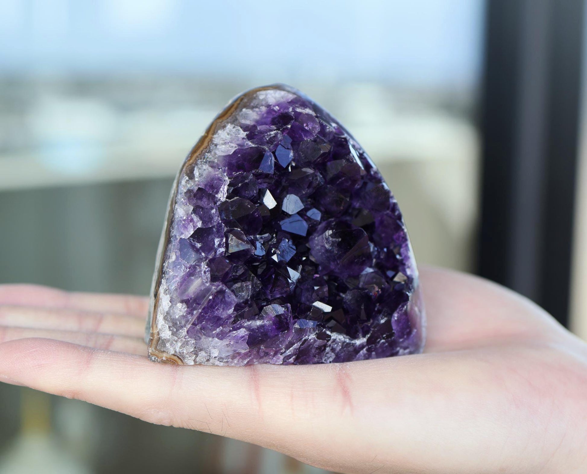 This natural purple amethyst geode cluster weighs 339g and measures 6.9cm in height and 7.4cm in width. Its deep violet crystals with exceptional clarity and luster showcase the raw beauty of amethyst.